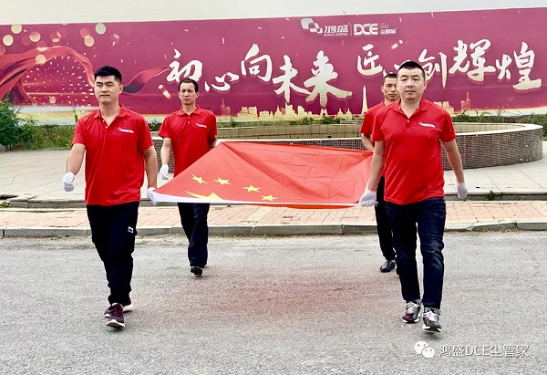 五星紅旗與廠旗隨風(fēng)飄揚(yáng)