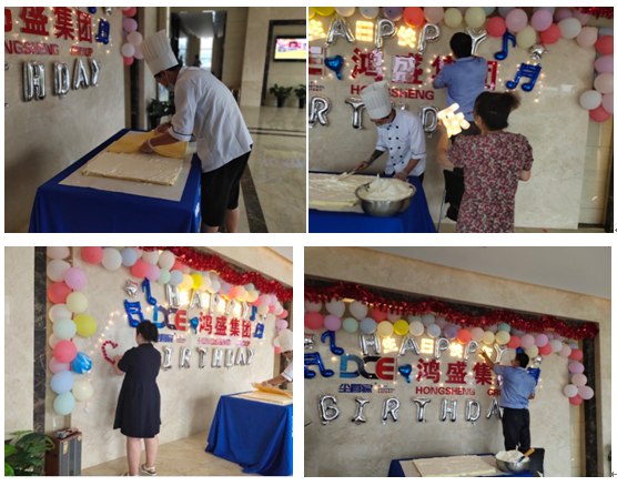 8月31日下午,新洪源公司一樓大廳張燈結彩,喜氣洋洋。師傅正在現(xiàn)場為55位壽星做生日蛋糕。