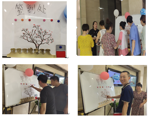 準備就緒后,壽星們陸續(xù)進場簽到并領取抽獎券,大家紛紛在背景墻前拍照合影。由壽星們齊按的手印做成了鴻盛樹,每位員工是樹葉,公司是大樹,共同組成了鴻盛大家庭。